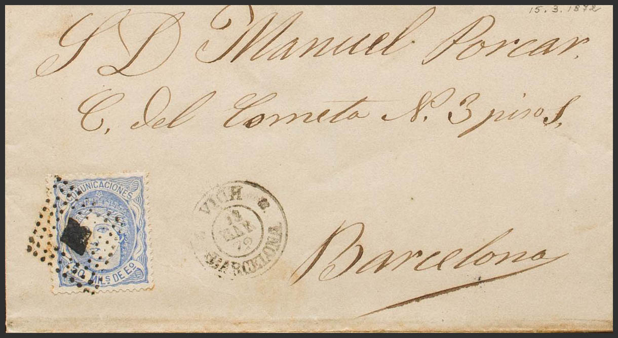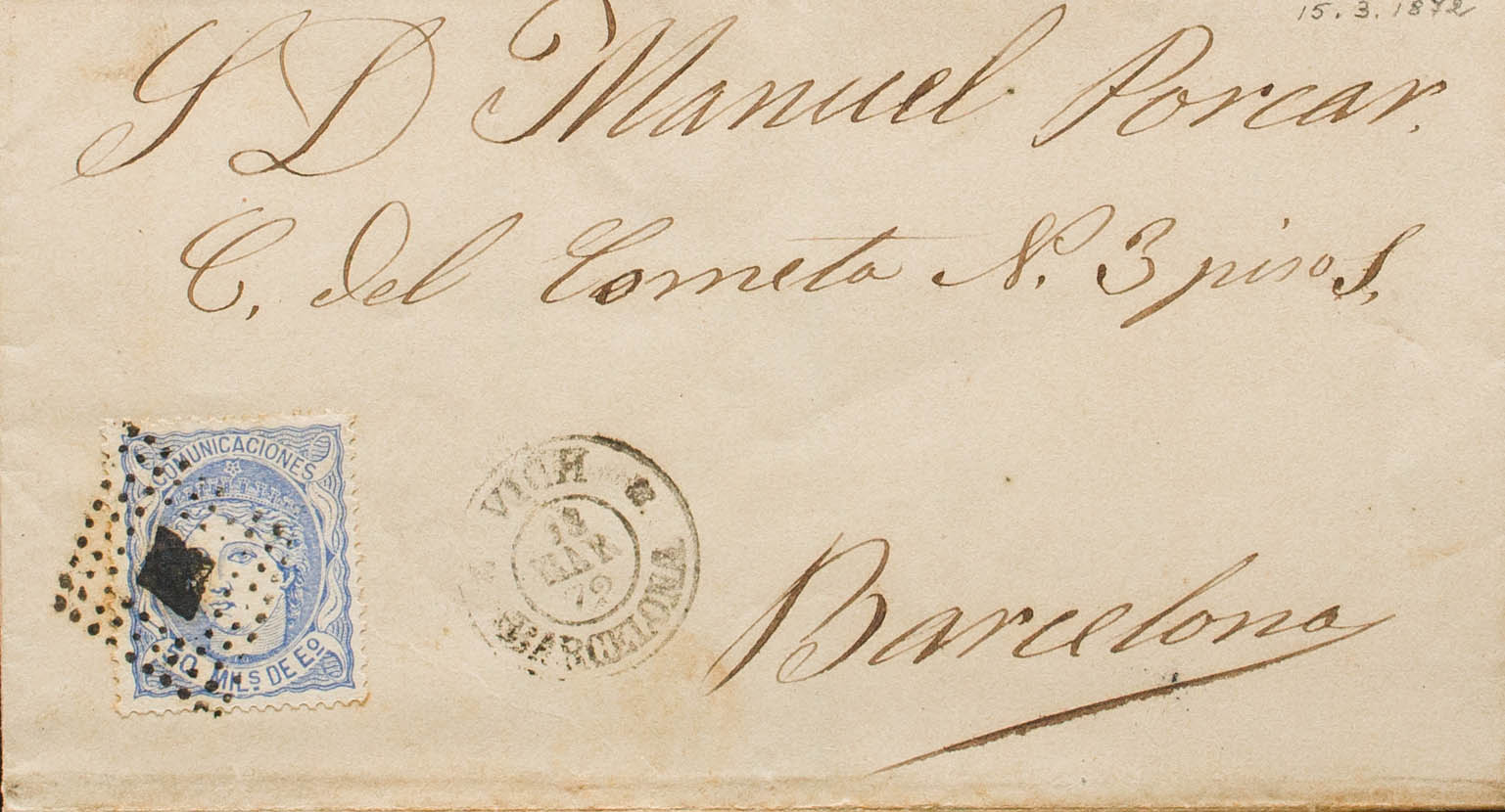 107. 1872. 50 mils ultramar. VICH a BARCELONA. En el frente fechador especial (con adornos) VICH / BARCELONA. MAGNIFICA. Ex-Tizón.