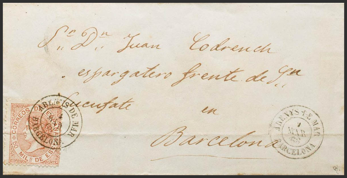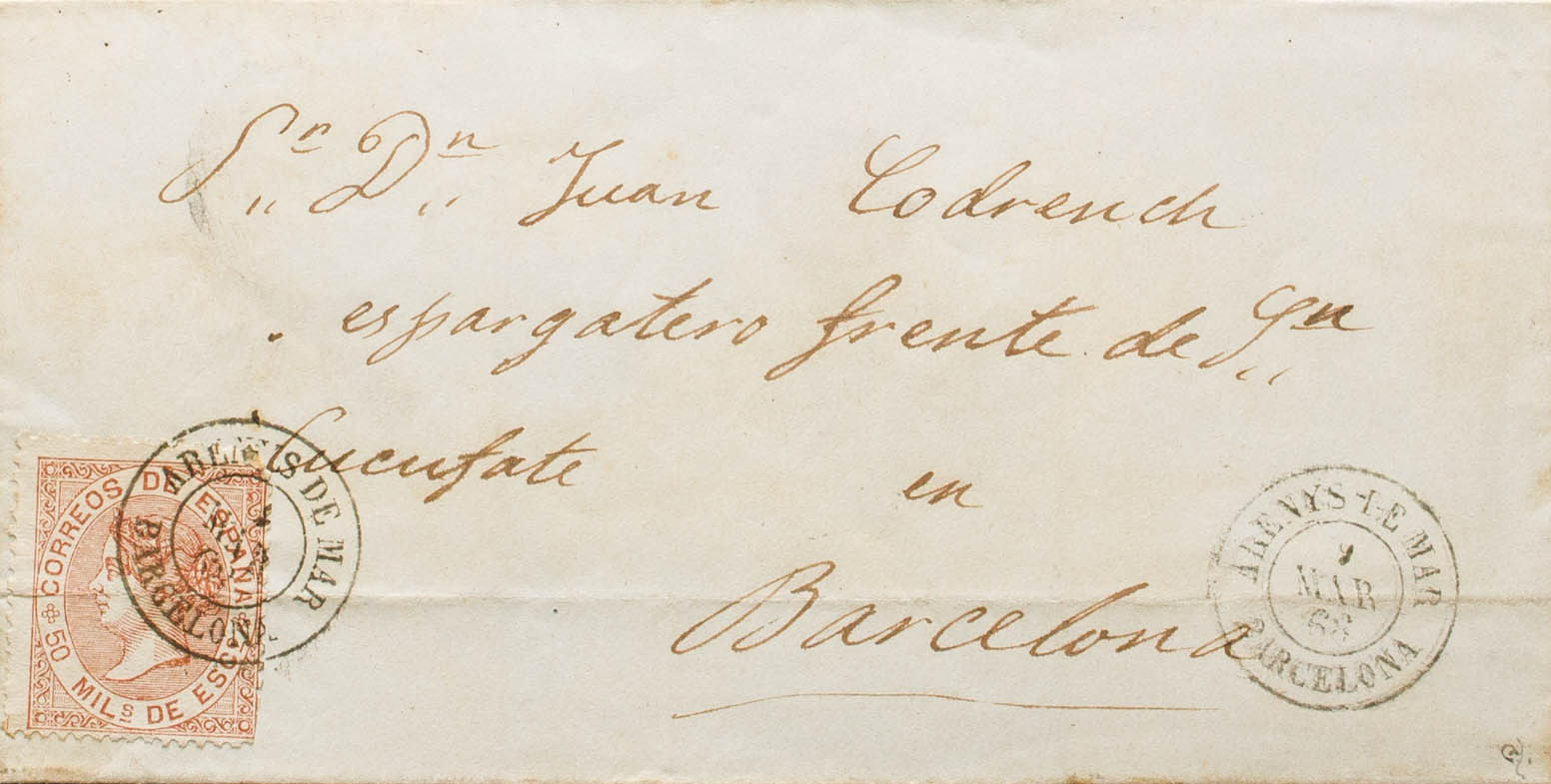 96. 1868. 50 mils castaño amarillo (doblez de archivo). ARENYS DE MAR a BARCELONA. Matasello ARENYS DE MAR / BARCELONA. BONITA Y RARA. Ex-Tizón.