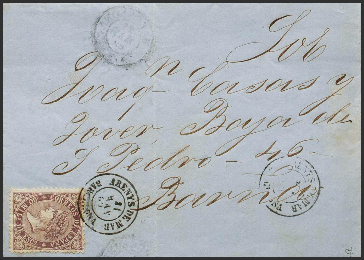 98. 1869. 50 mils violeta. ARENYS DE MAR a BARCELONA. Matasello ARENYS DE MAR / BARCELONA. MAGNIFICA Y RARA. Ex-Tizón.