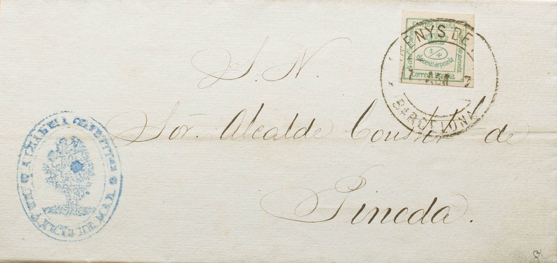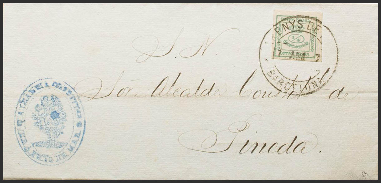 173. 1897. ¼ cts verde. Impreso de ARENYS DE MAR a PINEDA. Matasello trébol ARENYS DE MAR / (BARCELONA). MAGNIFICA Y RARA. Ex-Tizón.