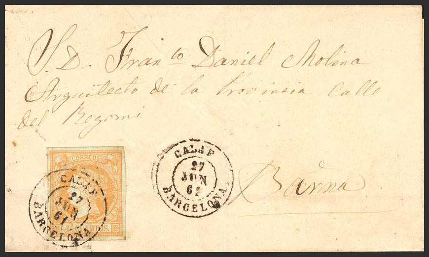52. 1860. 4 cuartos amarillo. CALAF a BARCELONA. Matasello CALAF / BARCELONA.