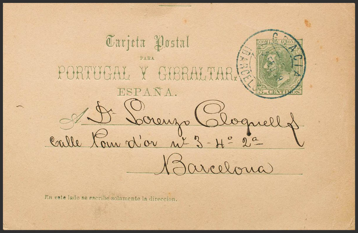 EP13. 1889. 5 cts verde sobre Tarjeta Entero Postal. GRACIA a BARCELONA. Matasello GRACIA / (BARCELONA), en azul. MAGNIFICA Y RARA. Ex-Tizón.