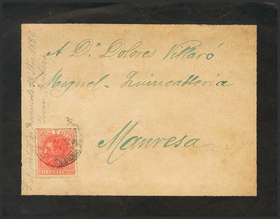 210. 1886. 15 cts naranja. SAN MARTIN DE PROVENSALS a MANRESA. Matasello trébol SAN MARTIN DE PROVENS. / (BARCELONA). MAGNIFICA. Ex-Tizón.