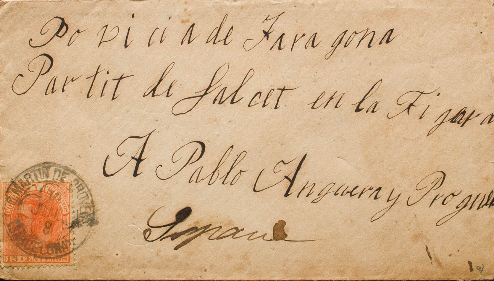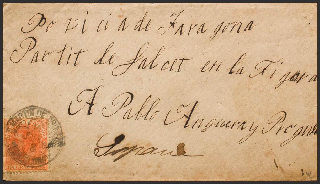 210. 1888. 15 cts naranja. SAN MARTIN DE PROVENSALS a FALSET. Matasello S. MARTIN DE PROVENS. / (BARCELONA). BONITA Y RARA. Ex-Tizón.