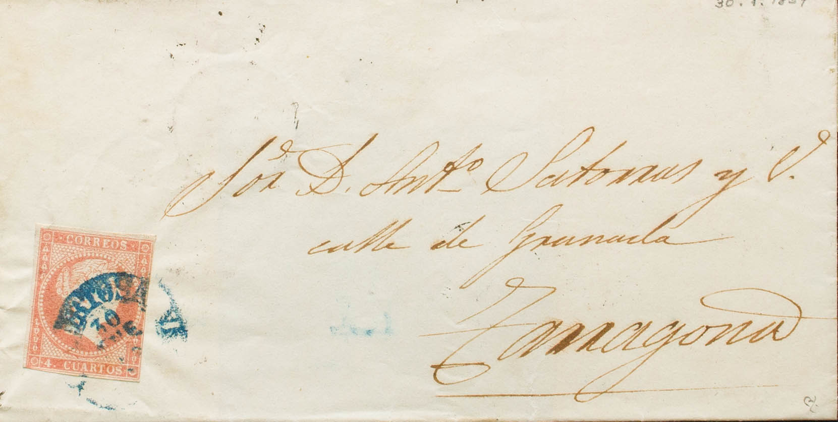 48. 1859. 4 cuartos rosa. TORTOSA a TARRAGONA. Matasello TORTOSA / TARRAGONA (Tipo I), en azul. BONITA. Ex-Tizón.