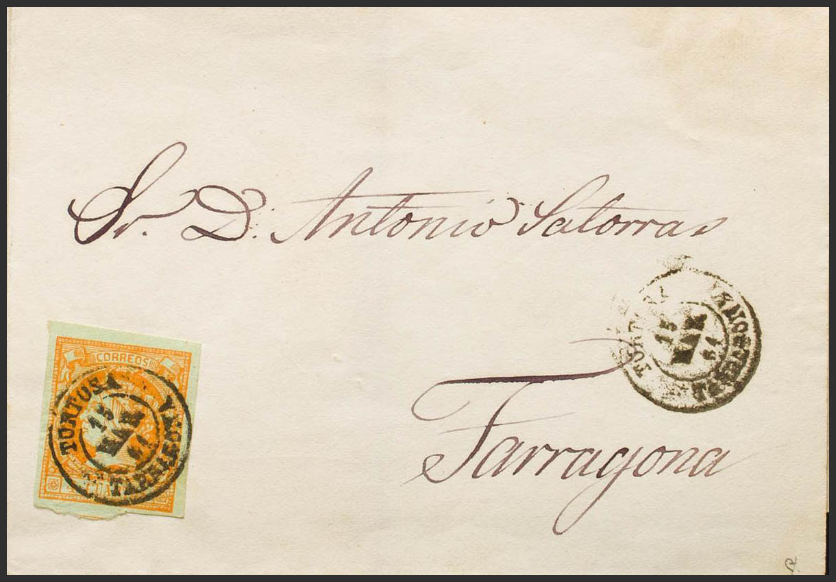 52. 1861. 4 cuartos naranja. TORTOSA a TARRAGONA. Matasello TORTOSA / TARRAGONA. MAGNIFICA. Ex-Tizón.