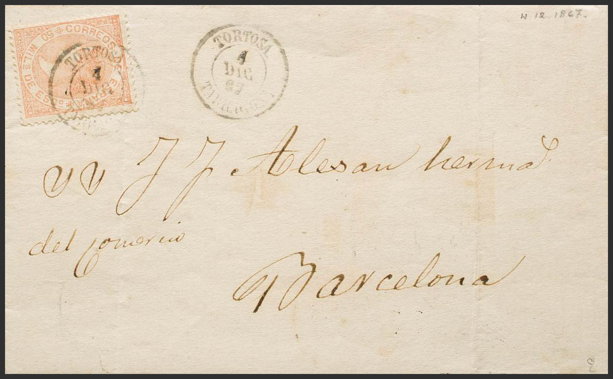 96. 1867. 50 mils castaño amarillo. TORTOSA a BARCELONA. Matasello TORTOSA / TARRAGONA. MAGNIFICA. Ex-Tizón.