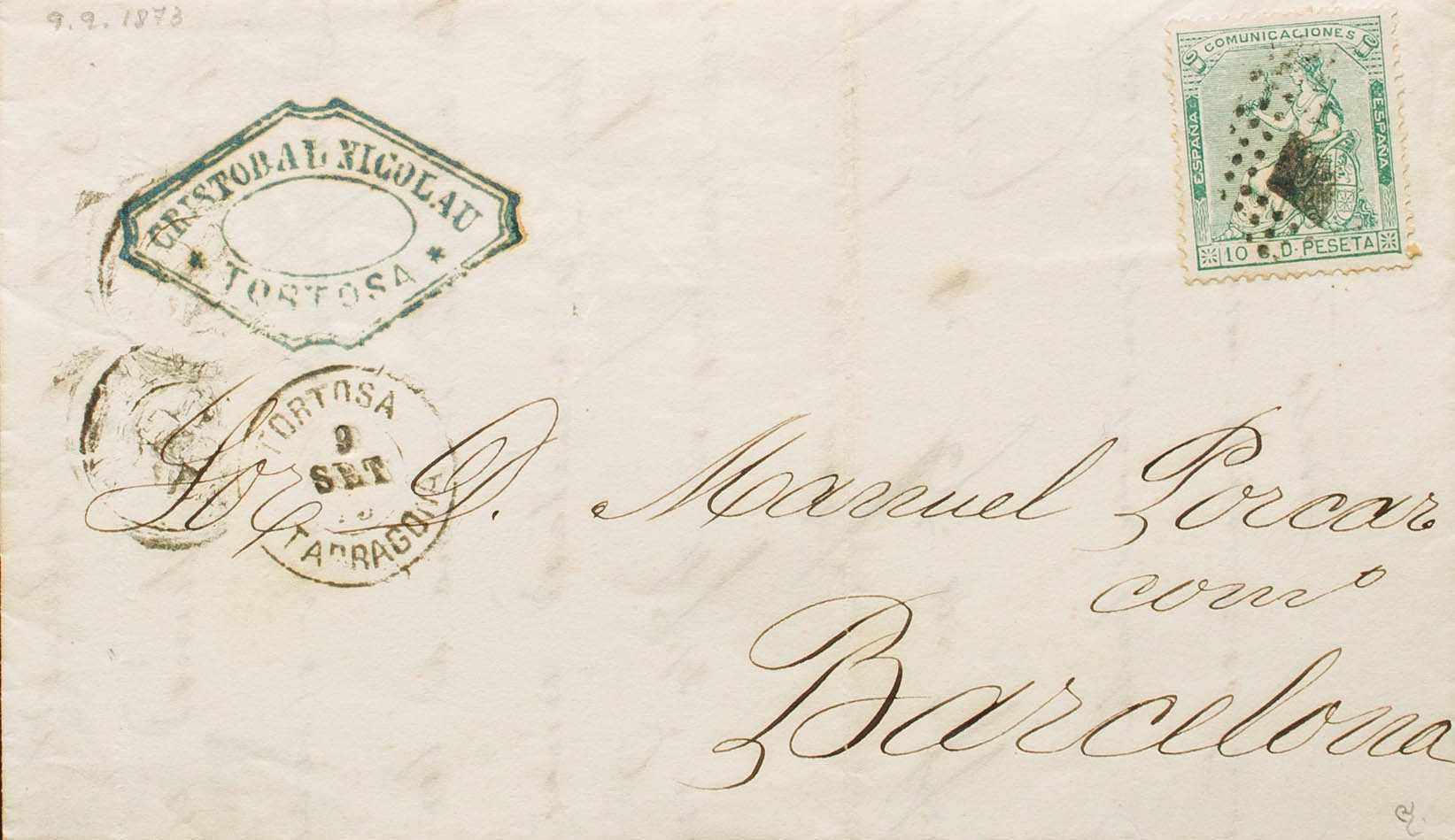 133. 1873. 10 cts verde. TORTOSA a BARCELONA. En el frente fechador TORTOSA / TARRAGONA. MAGNIFICA. Ex-Tizón.
