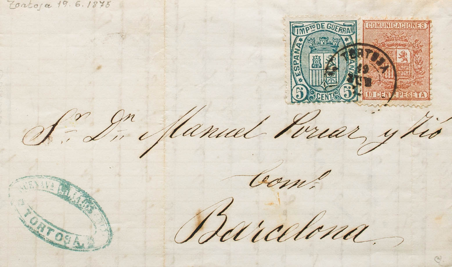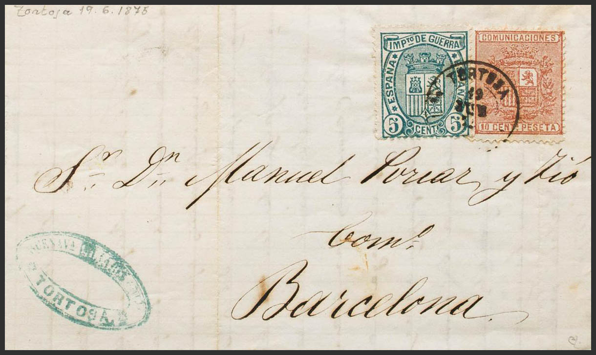 153, 154. 1875. 10 cts castaño y 5 cts verde. TORTOSA a BARCELONA. Matasello TORTOSA / TARRAGONA. MAGNIFICA. Ex-Tizón.
