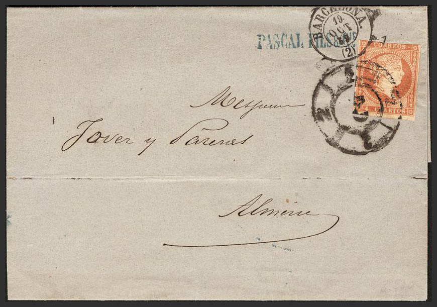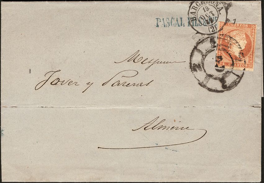 48. 1856. 4 cuartos rojo. BARCELONA a ALMERIA. Matasello R. CARRETA Nº 2. BONITA.
