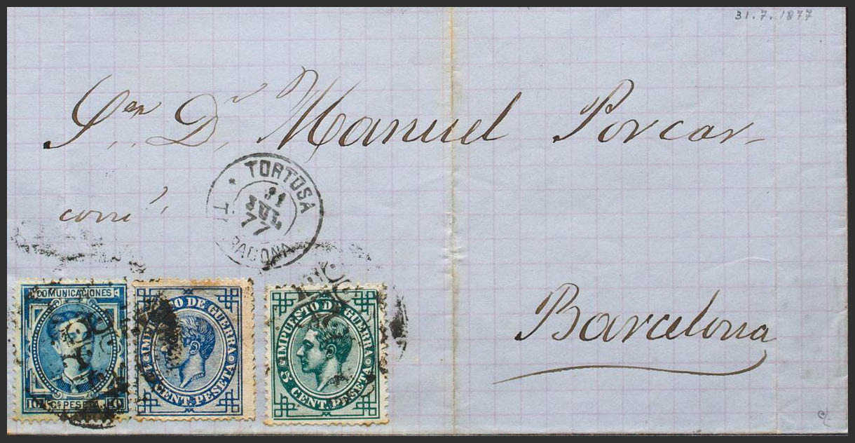 175, 183, 184. 1877. 10 cts azul, 5 cts verde y 10 cts azul. TORTOSA a BARCELONA. Matasello TORTOSA / TARRAGONA. MAGNIFICA. Ex-Tizón.