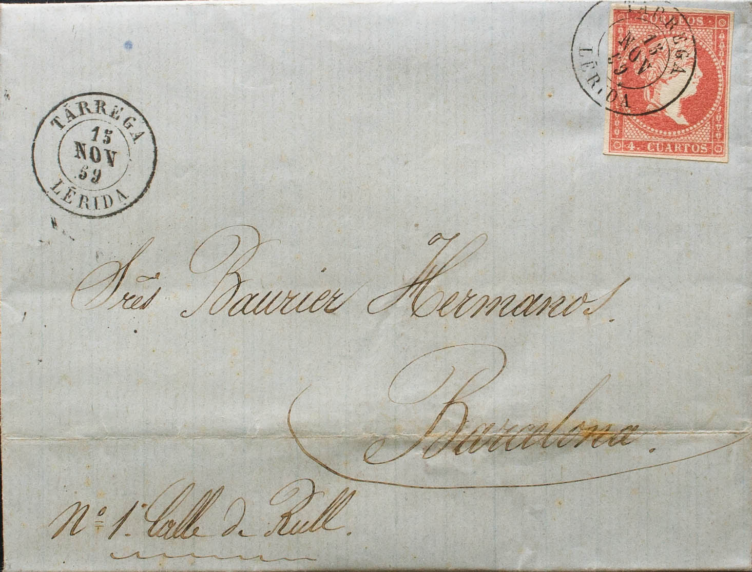 48. 1859. 4 cuartos rojo. TARREGA a BARCELONA. Matasello TARREGA / LERIDA. MAGNIFICA. Ex-Tizón.