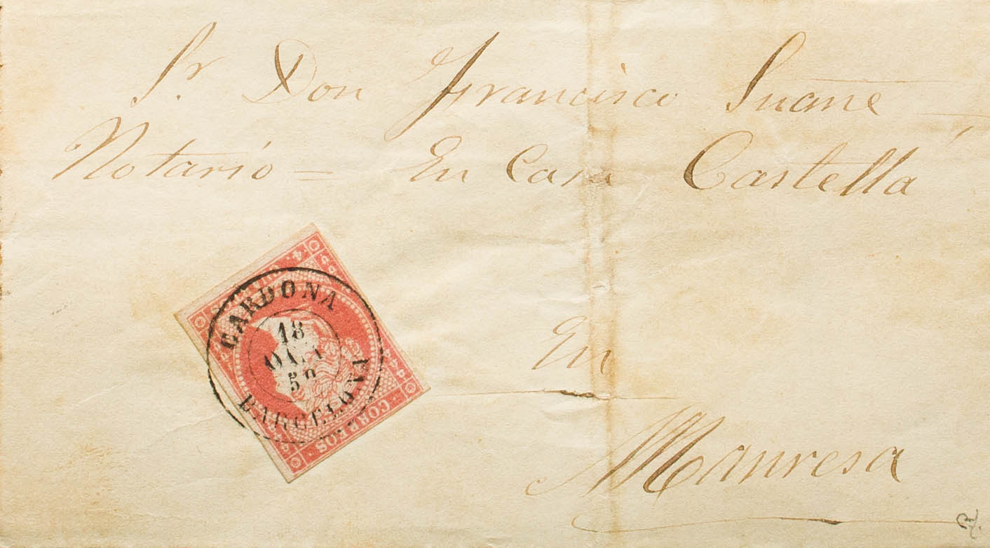 48. 1859. 4 cuartos rojo. CARDONA a MANRESA. Matasello CARDONA / BARCELONA. MAGNIFICA. Ex-Tizón.