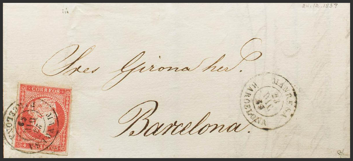 48. 1859. 4 cuartos rojo. MANRESA a BARCELONA. Matasello MANRESA / BARCELONA. MAGNIFICA. Ex-Tizón.