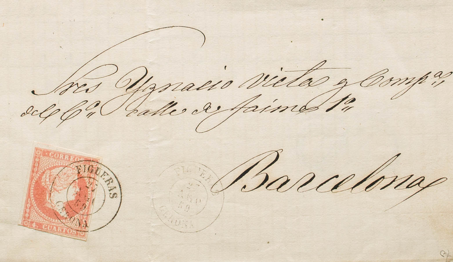 48. 1859. 4 cuartos rojo. FIGUERAS a BARCELONA. Matasello FIGUERAS / GERONA. MAGNIFICA. Ex-Tizón.