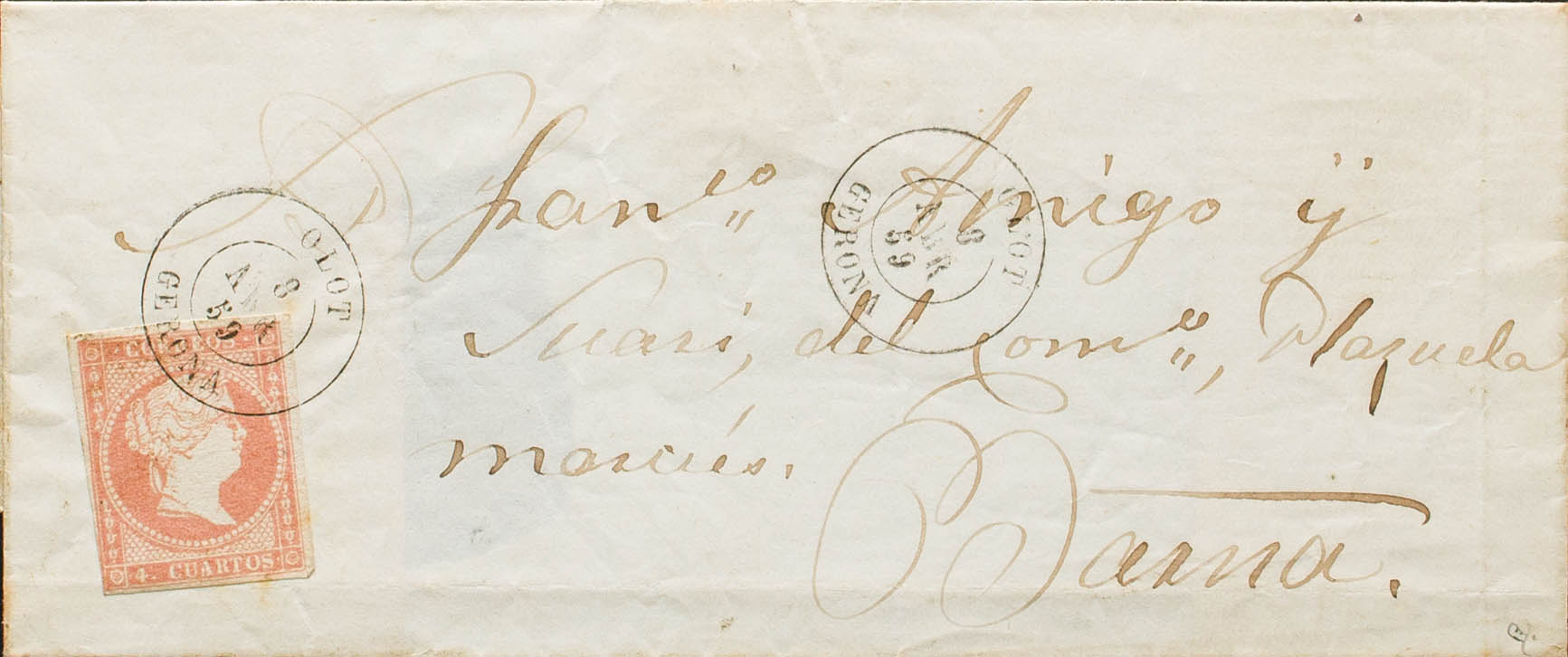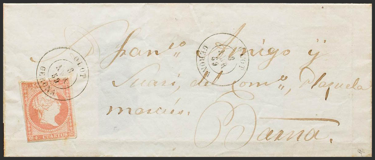 48. 1859. 4 cuartos rojo. OLOT a BARCELONA. Matasello OLOT / GERONA. MAGNIFICA Y RARA. Ex-Tizón.