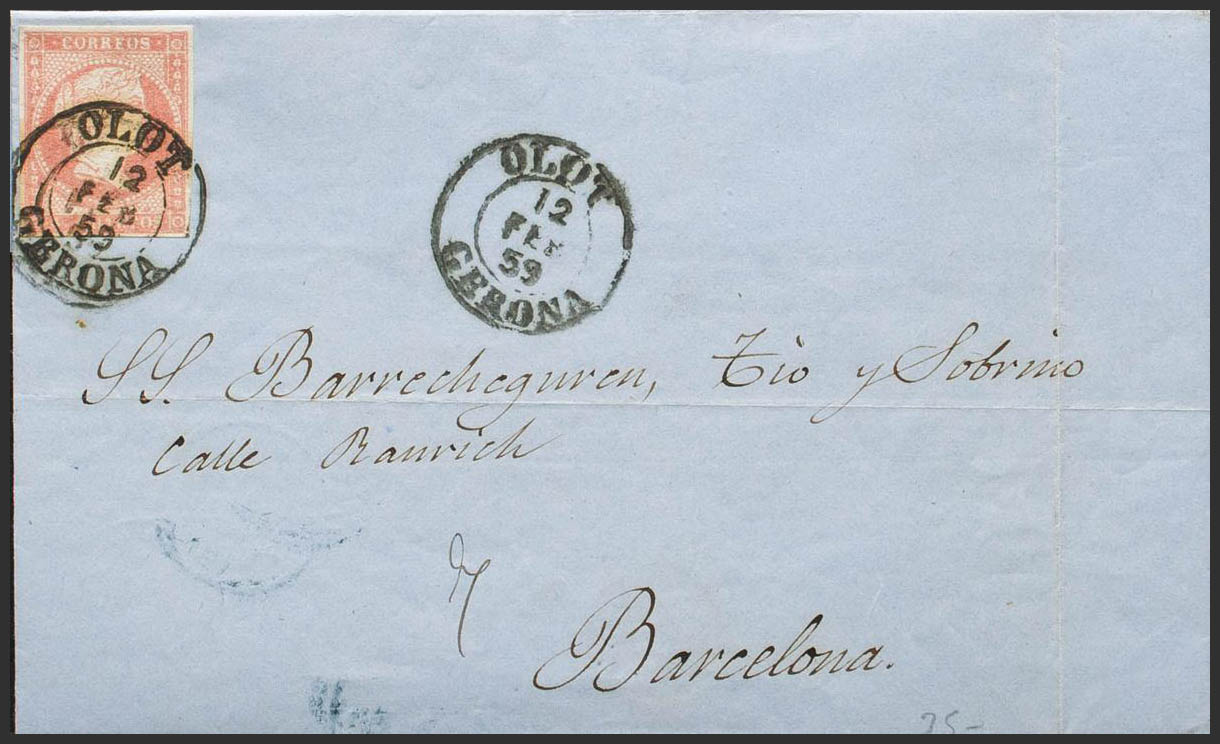 48. 1859. 4 cuartos rojo. OLOT a BARCELONA. Matasello OLOT / GERONA (Tipo I). MAGNIFICA Y RARA. Ex-Tizón.