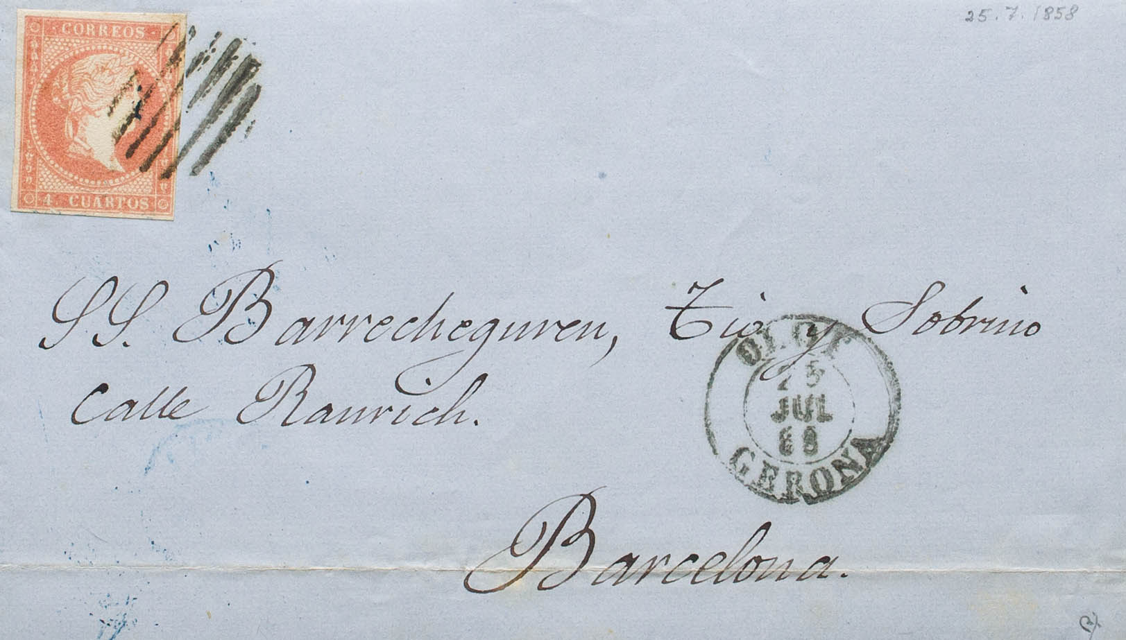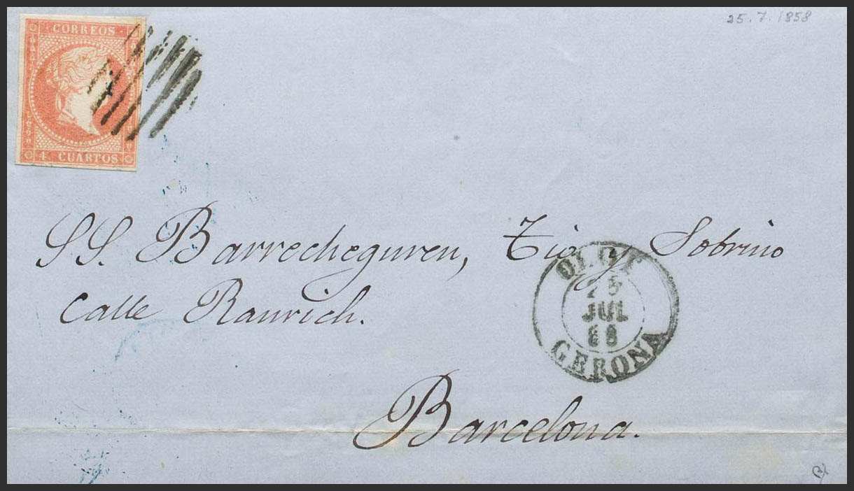 48. 1858. 4 cuartos rojo. OLOT a BARCELONA. En el frente fechador OLOT / GERONA (Tipo I). MAGNIFICA. Ex-Tizón.