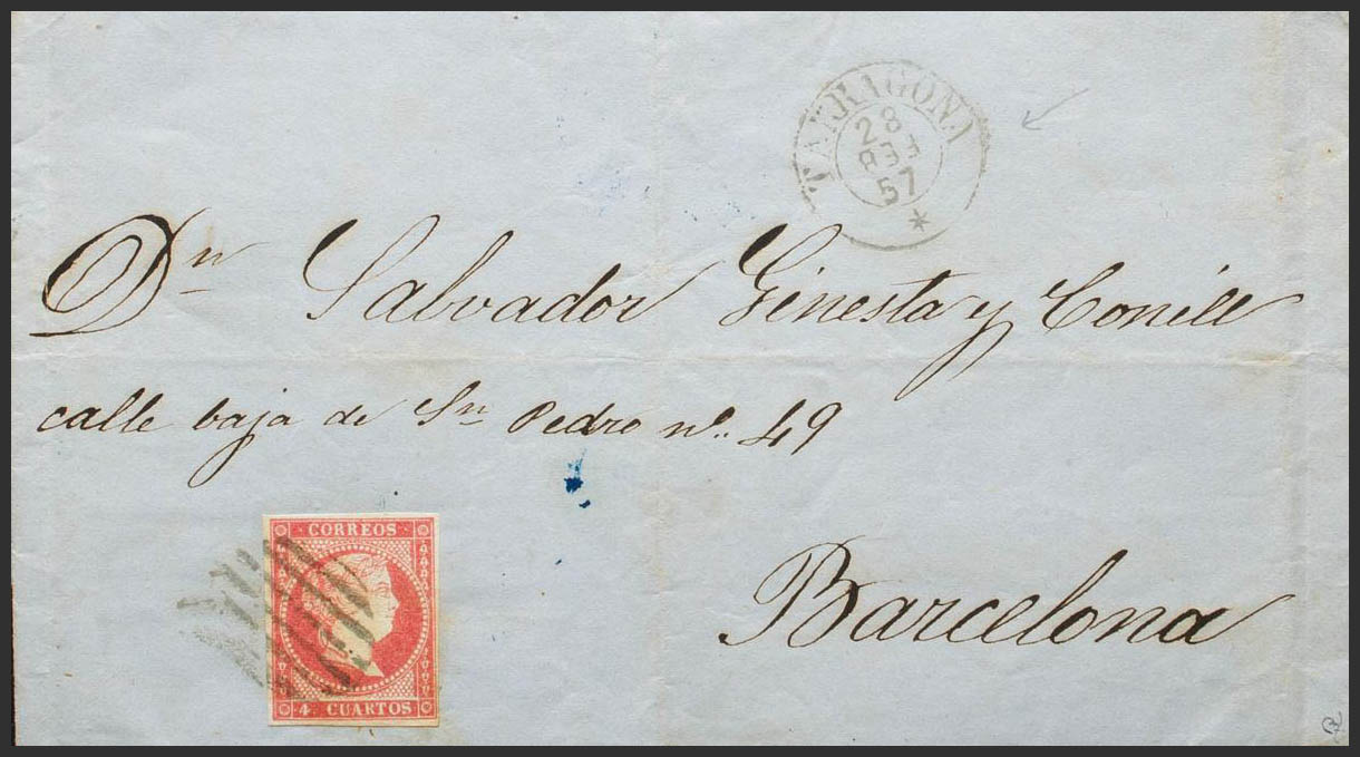 48. 1857. 4 cuartos rojo. TARRAGONA a BARCELONA. En el frente fechador TARRAGONA / * (Tipo I). MAGNIFICA. Ex-Tizón.