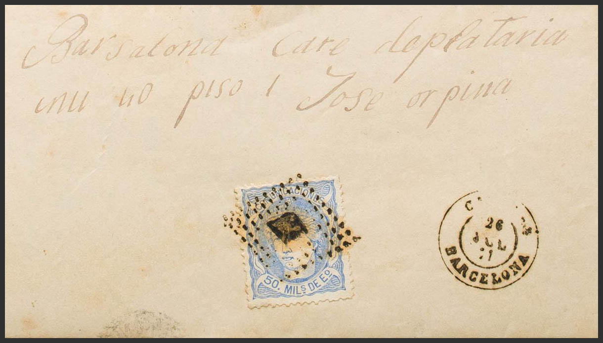 107. 1871. 50 mils ultramar. CALAF a BARCELONA. En el frente fechador CALAF / BARCELONA. MAGNIFICA. Ex-Tizón.