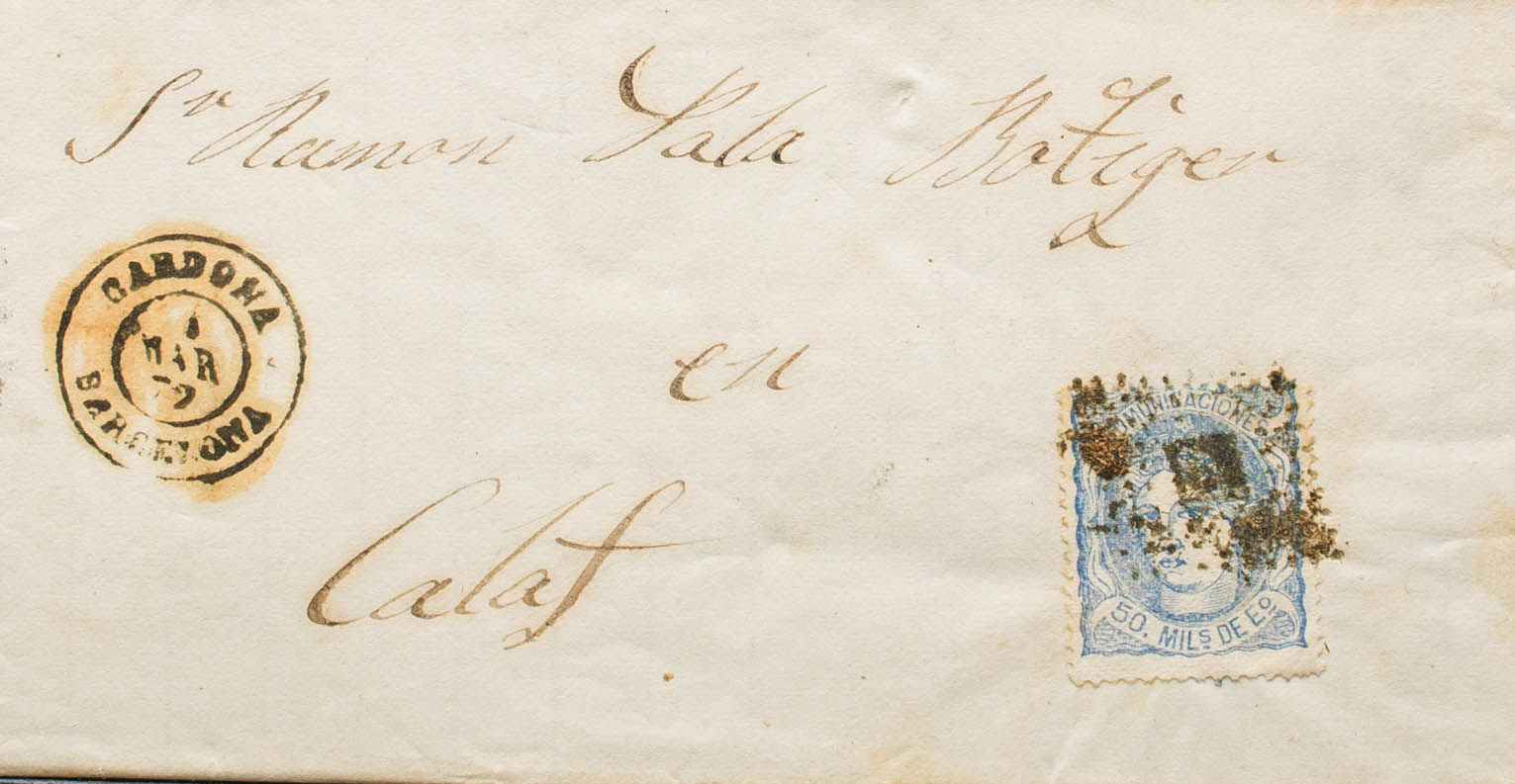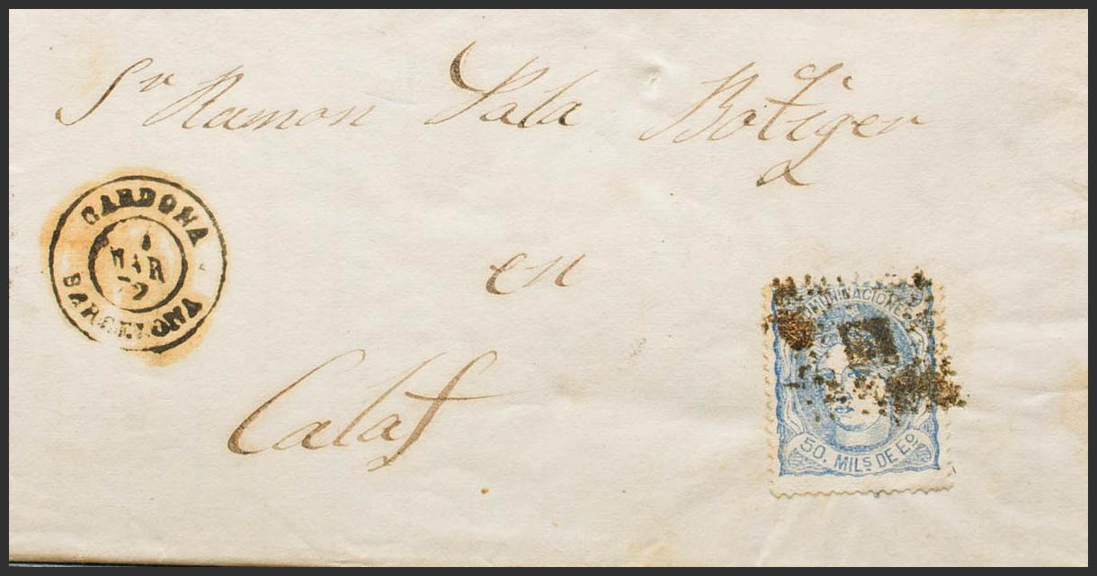 107. 1872. 50 mils ultramar. CARDONA a CALAF. En el frente fechador CALAF / BARCELONA. MAGNIFICA. Ex-Tizón.