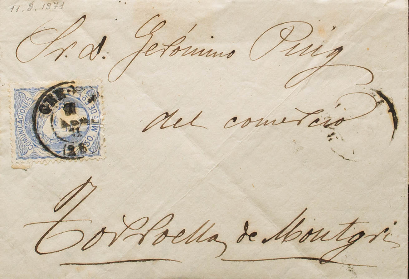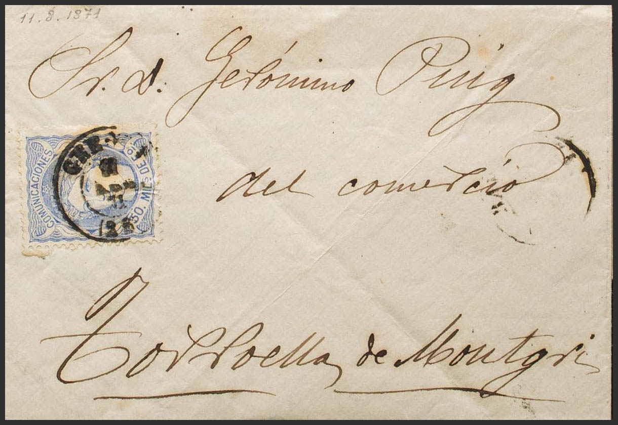 107. 1871. 50 mils ultramar. BARCELONA a TORROELLA DE MONTGRI. Matasello GERONA / (26), aplicado en tránsito. MAGNIFICA Y RARA. Ex-Tizón.