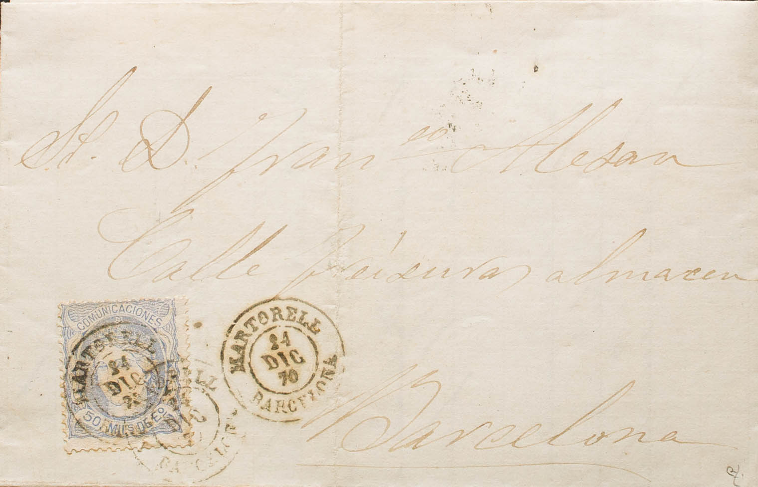 107. 1870. 50 mils ultramar. ESPARRAGUERA a BARCELONA. Matasello MARTORELL / BARCELONA. MAGNIFICA Y RARA. Ex-Tizón.