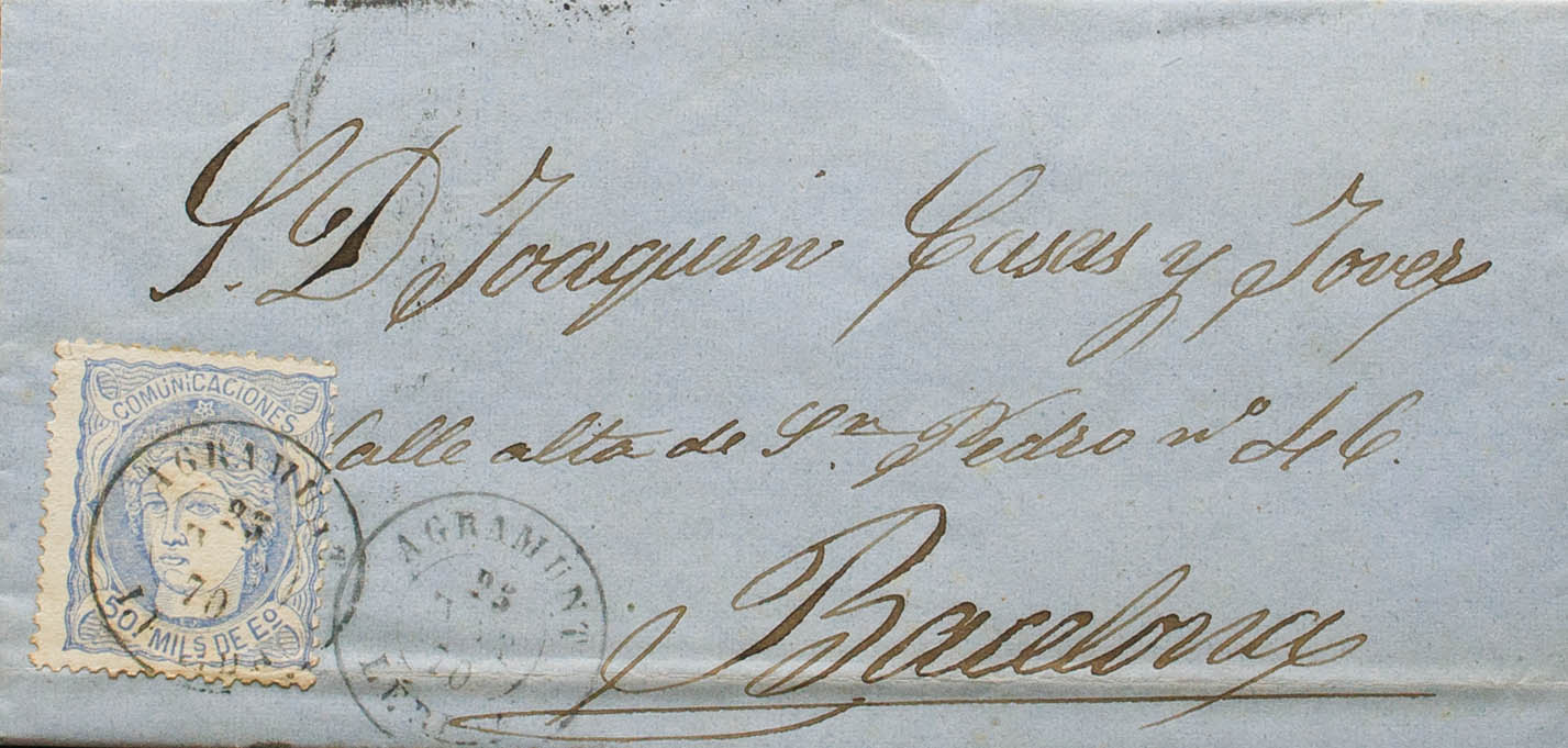 107. 1870. 50 mils ultramar. AGRAMUNT a BARCELONA. Matasello AGRAMUNT / LERIDA. MAGNIFICA Y RARA. Ex-Tizón.
