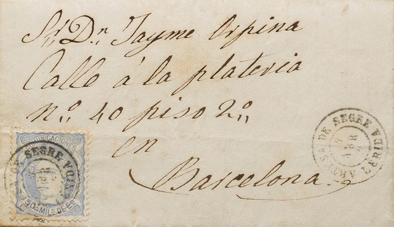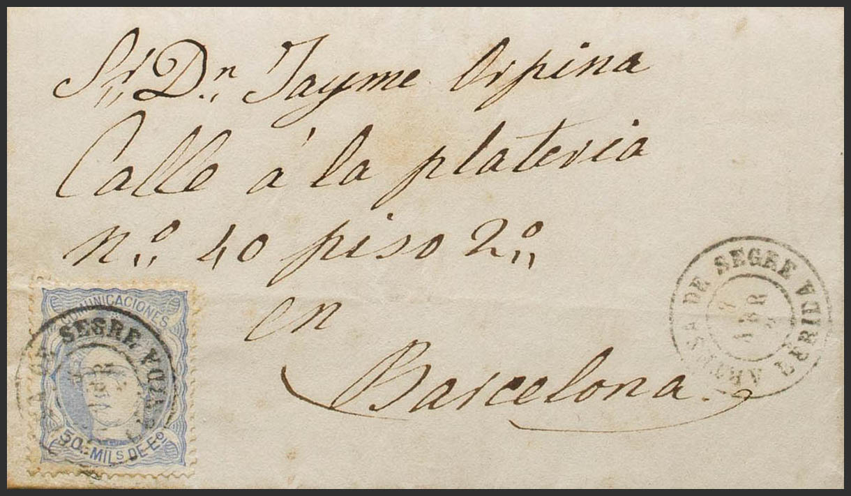 107. 1870. 50 mils ultramar. OLIANA a BARCELONA. Matasello ARTESA DE SEGRE / LERIDA. MAGNIFICA Y RARA. Ex-Tizón.