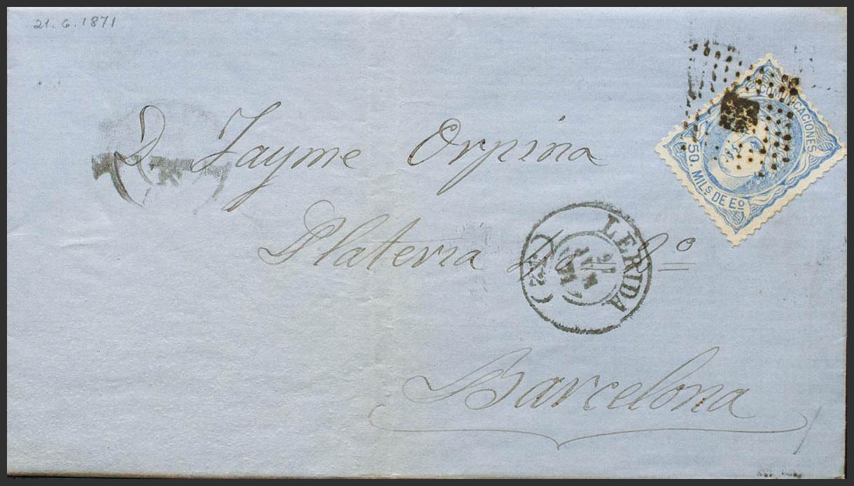 107. 1871. 50 mils ultramar. LERIDA a BARCELONA. En el frente fechador LERIDA / (32). MAGNIFICA. Ex-Tizón.