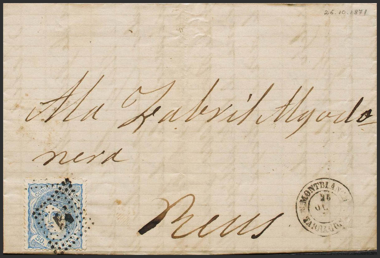 107. 1871. 50 mils ultramar. SANTA COLOMA a REUS. En el frente fechador MONTBLANCH / TARRAGONA. MAGNIFICA. Ex-Tizón.