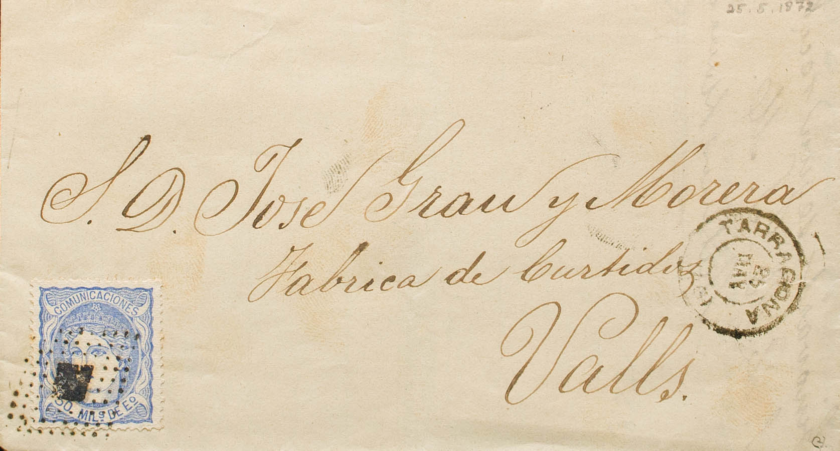107. 1872. 50 mils ultramar. TARRAGONA a VALLS. En el frente fechador TARRAGONA / (46). MAGNIFICA. Ex-Tizón.