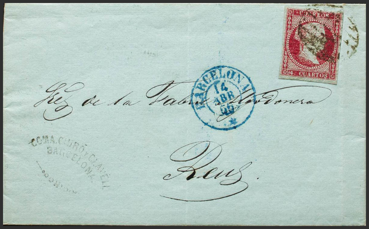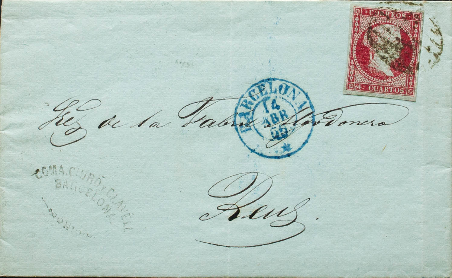 40. 1855. 4 cuartos carmÃn. BARCELONA a REUS. En el frente fechador BARCELONA / * (Tipo I), en azul. MAGNIFICA. Ex-Tizón.