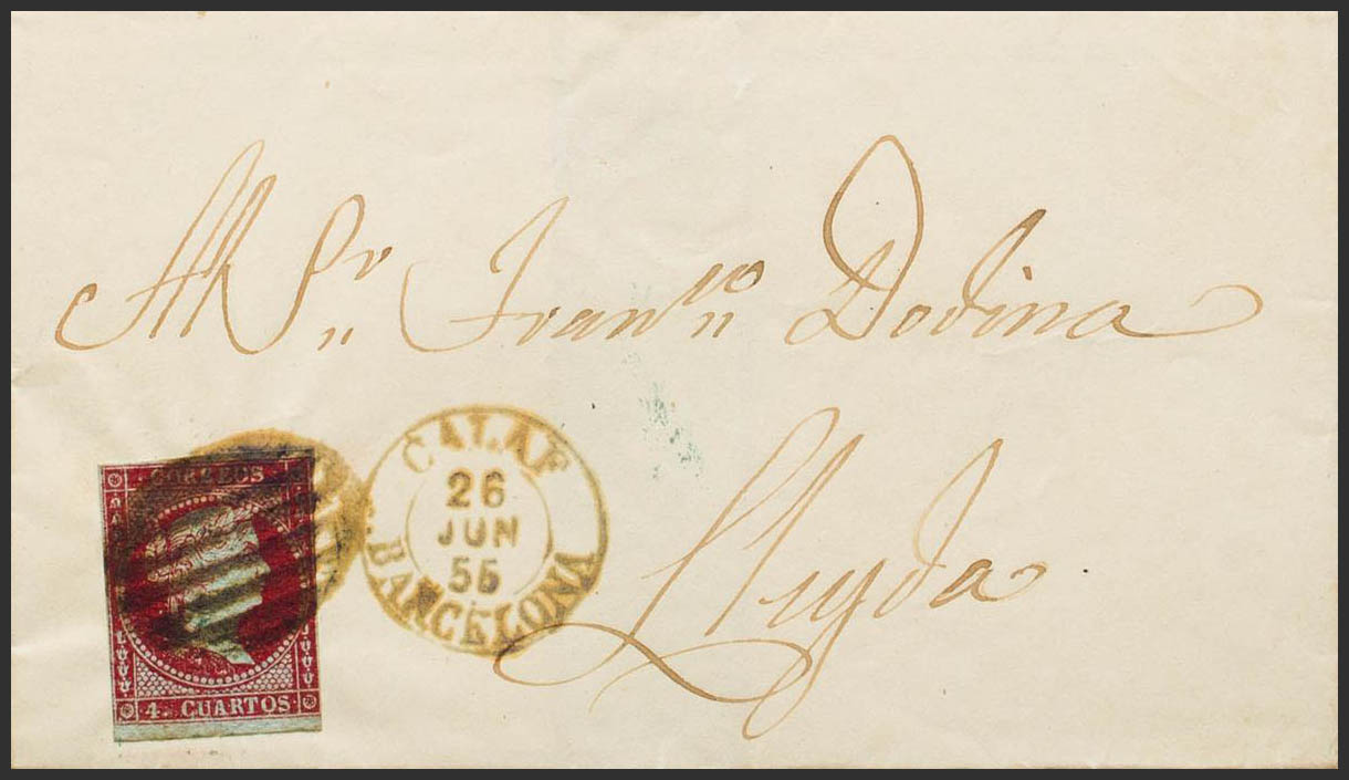 40. 1855. 4 cuartos carmÃn. CALAF a LERIDA. Matasello PARRILLA, en azul y en el frente fechador CALAF / BARCELONA (Tipo I), en azul. MAGNIFICA. Ex-Tizón.