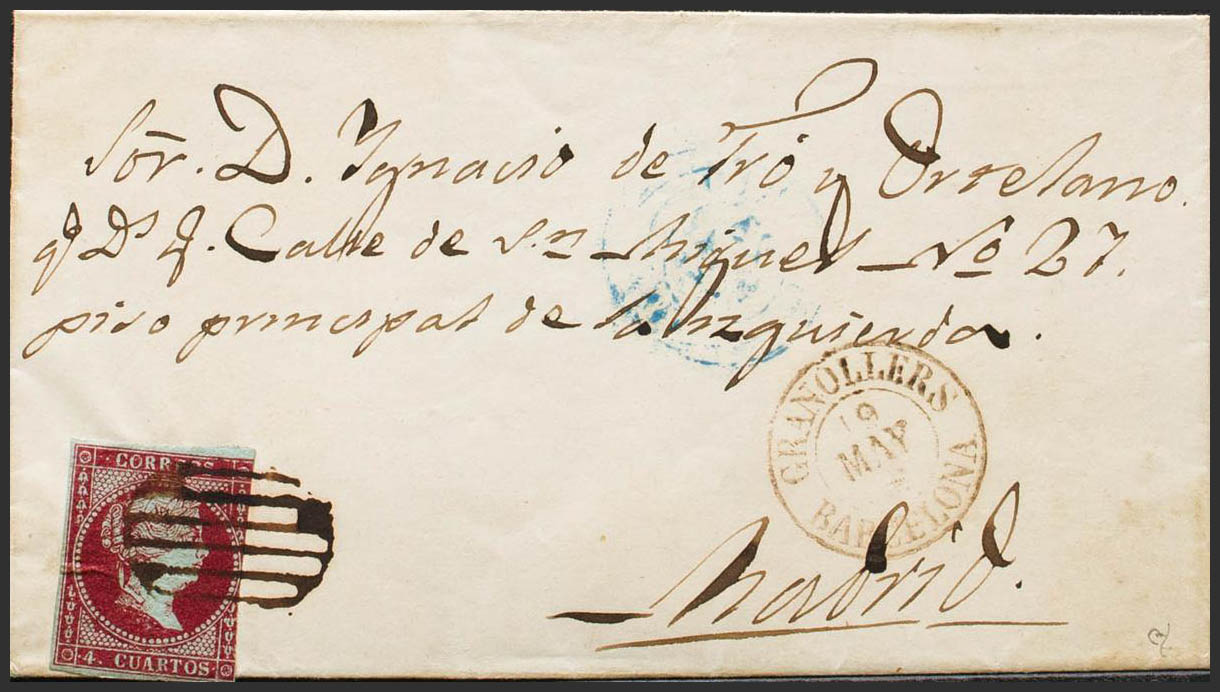 40. 1856. 4 cuartos carmÃn. GRANOLLERS a MADRID. En el frente fechador GRANOLLERS / BARCELONA (Tipo I). MAGNIFICA. Ex-Tizón.