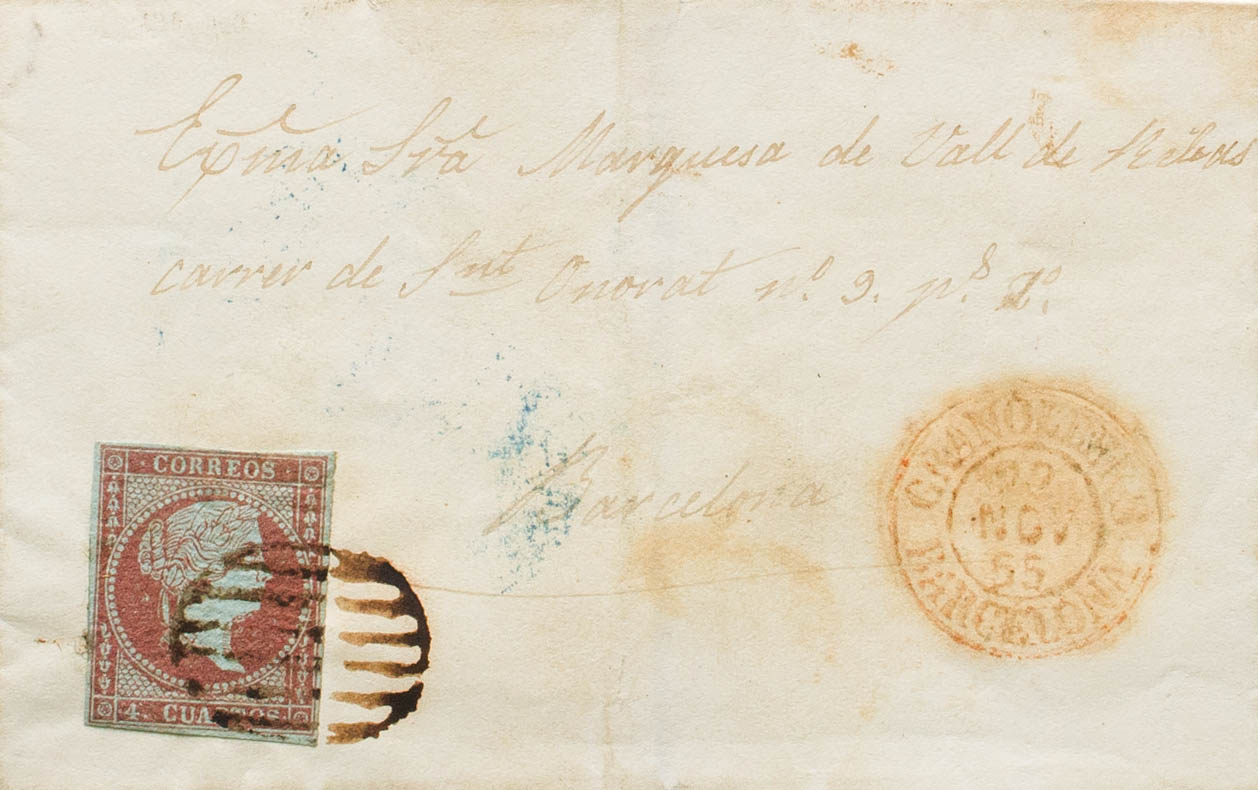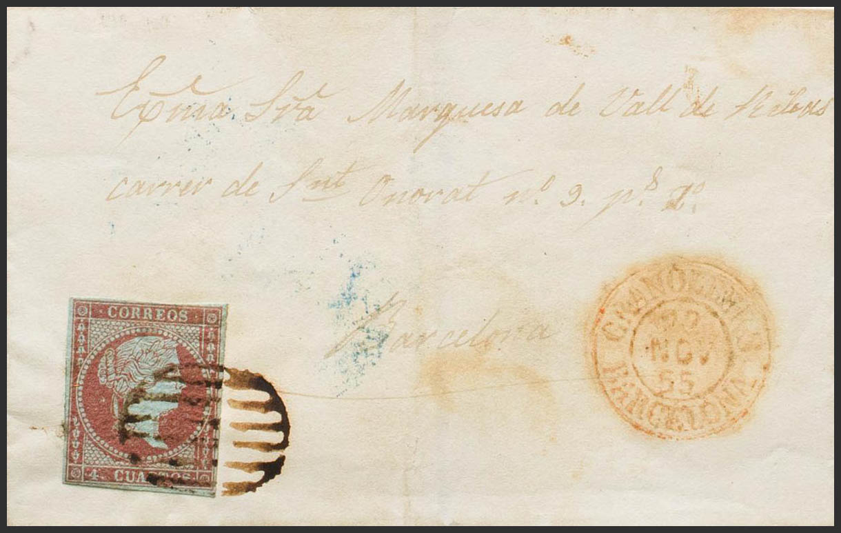 40. 1855. 4 cuartos rojo. GRANOLLERS a BARCELONA. Matasello PARRILLA, en tinta de escribir y en el frente fechador GRANOLLERS / BARCELONA (Tipo I), en rojo. MAGNIFICA. Ex-Tizón.
