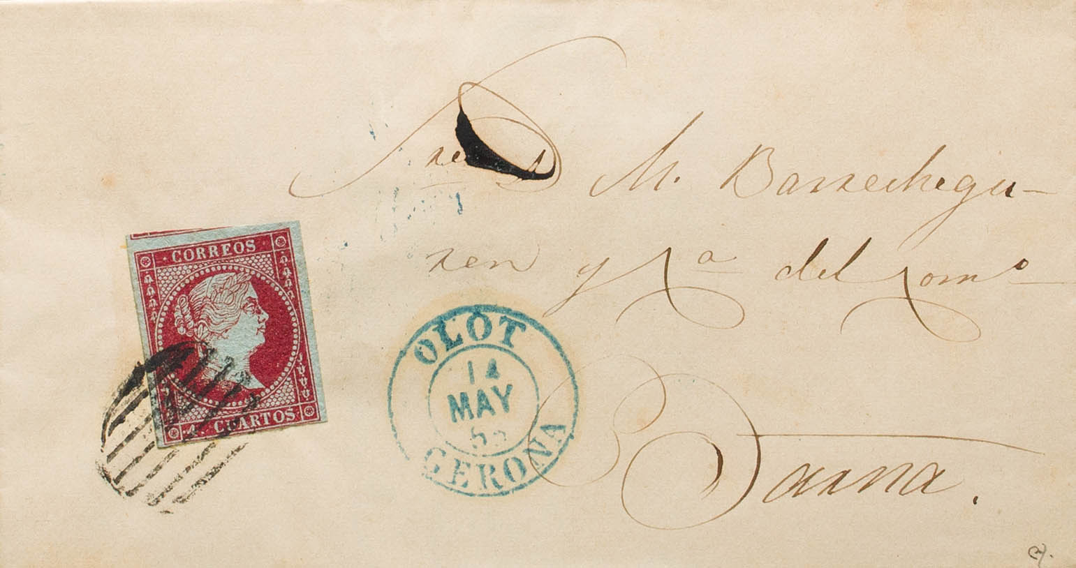 40. 1855. 4 cuartos carmín. OLOT a BARCELONA. En el frente fechador OLOT / GERONA (Tipo I), en azul. MAGNIFICA. Ex-Tizón.