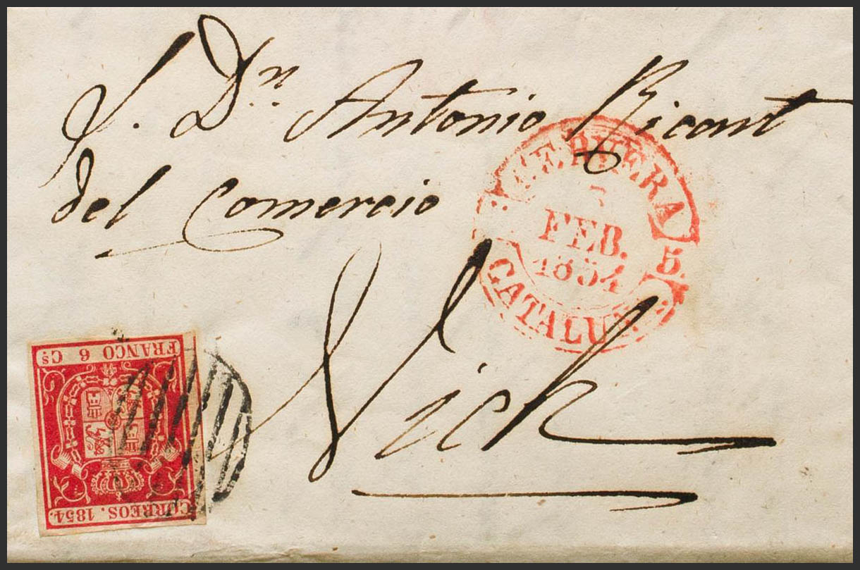 24. 1854. 6 cuartos carmÃn. CERVERA a VICH. En el frente baeza CERVERA / CATALUÑA. MAGNIFICA. Ex-Tizón.