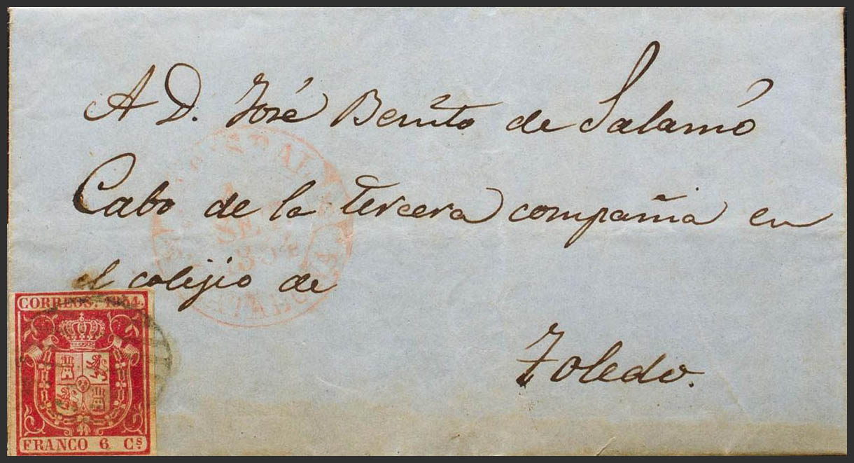 24. 1854. 6 cuartos carmín. LA BISBAL a TOLEDO. En el frente baeza LA BISBAL / CATALUÑA. MAGNIFICA. Ex-Tizón.