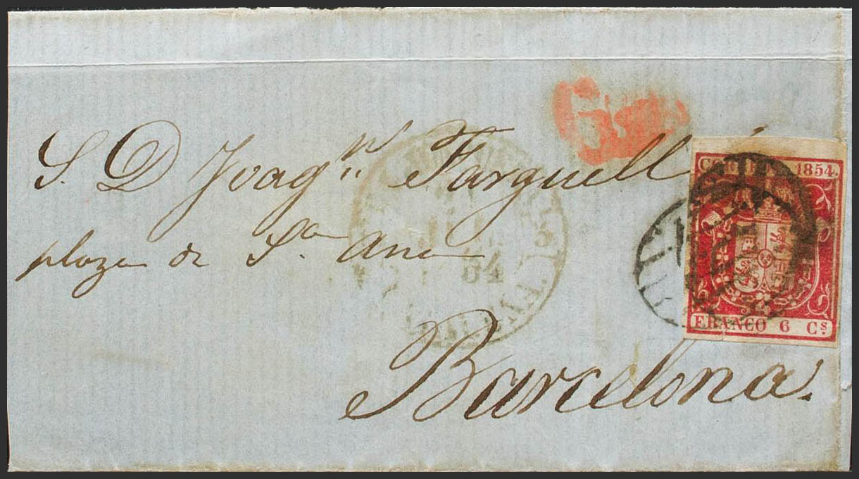 24. 1854. 6 cuartos carmÃn. LA JUNQUERA a BARCELONA. En el frente baeza LA JUNQUERA / CATALUÑA, en azul. MAGNIFICA. Ex-Tizón.