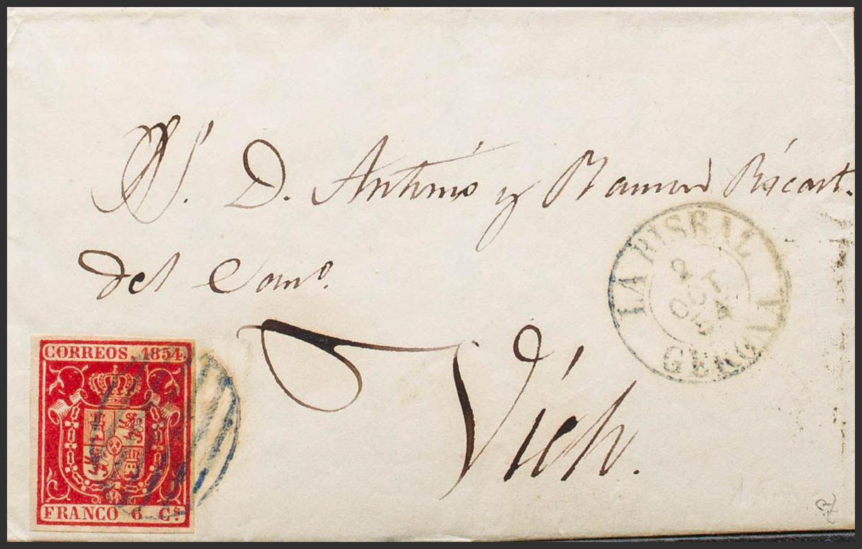 24. 1854. 6 cuartos carmÃn. LA BISBAL a VICH. Matasello PARRILLA, en azul y en el frente fechador LA BISBAL / GERONA (Tipo I), en azul. MAGNIFICA. Ex-Tizón.