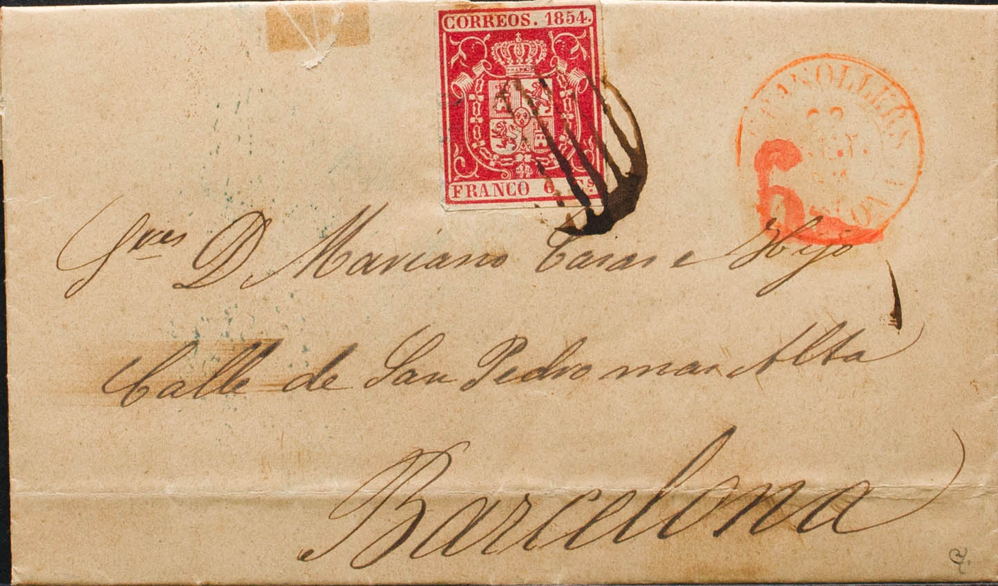 24. 1854. 6 cuartos carmín. CENTELLAS a BARCELONA. En el frente fechador GRANOLLERS / BARCELONA (Tipo I), en rojo. MAGNIFICA. Ex-Tizón.
