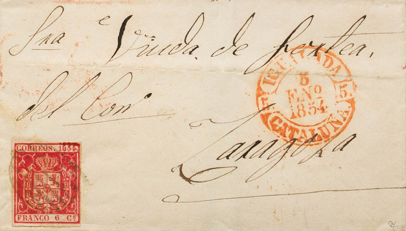 24. 1854. 6 cuartos carmín. IGUALADA a ZARAGOZA. En el frente baeza IGUALADA / CATALUÑA. MAGNIFICA. Ex-Tizón.