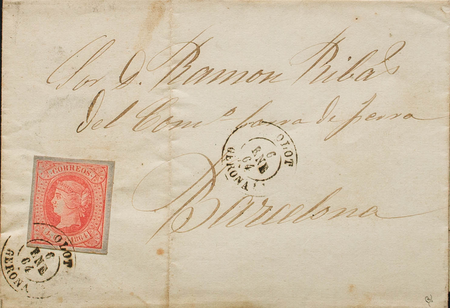 64. 1864. 4 cuartos rojo. OLOT a BARCELONA. Matasello OLOT / GERONA. MAGNIFICA. Ex-Tizón.