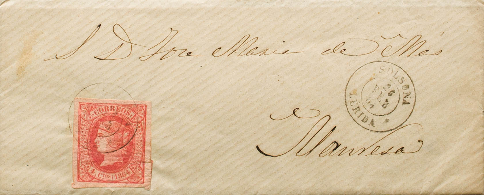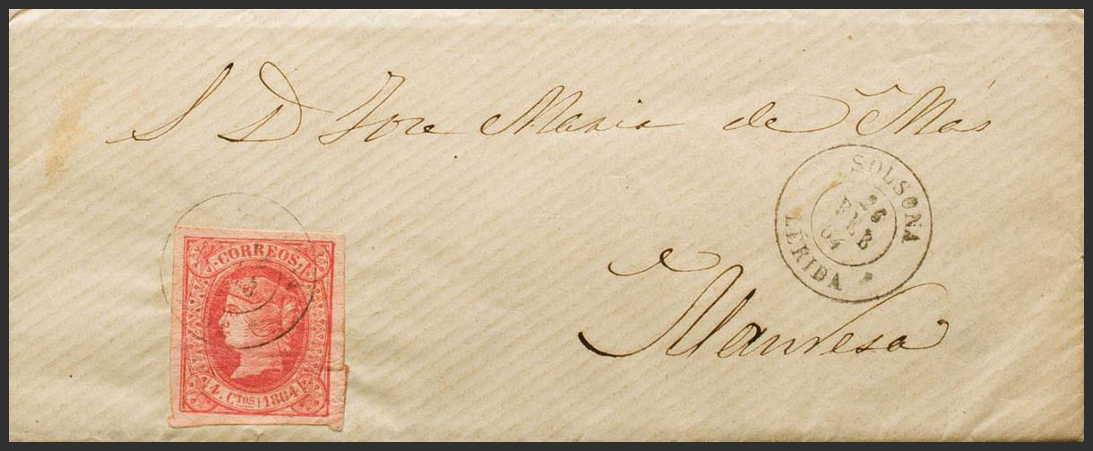 64. 1864. 4 cuartos rojo. SOLSONA a MANRESA. Matasello SOLSONA / LERIDA (débil estampación). BONITA Y RARA. Ex-Tizón.