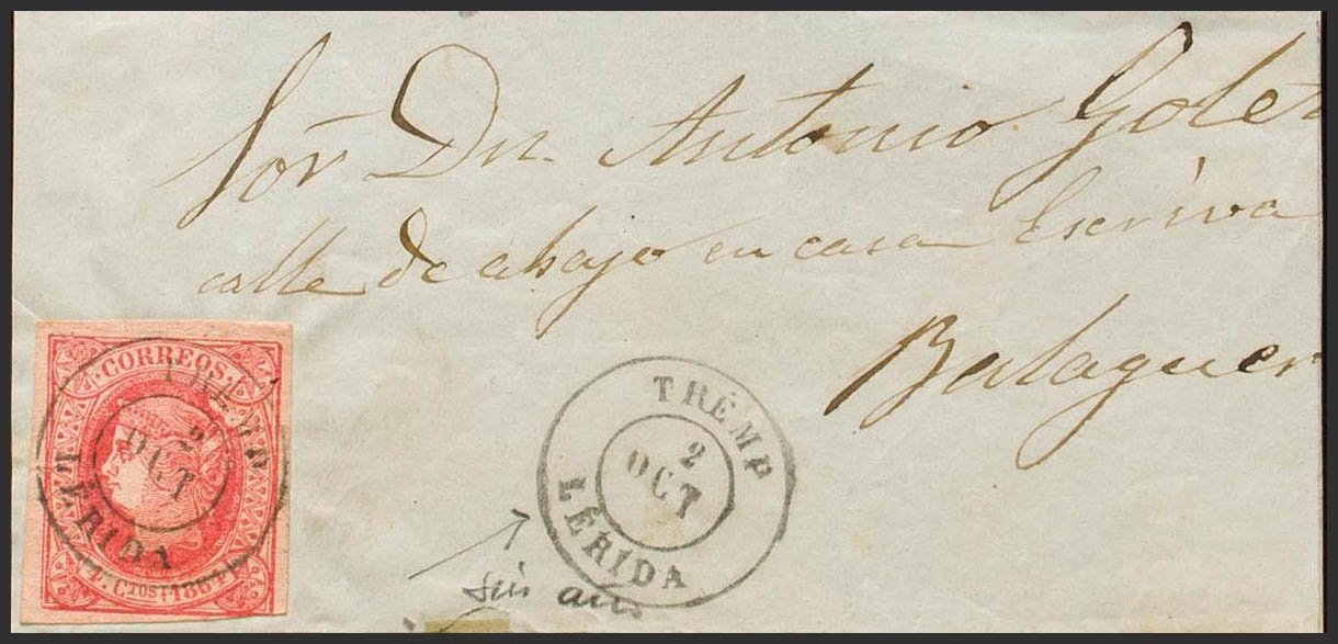 64. 1864. 4 cuartos rojo. Frontal de TREMP a BALAGUER. Matasello TREMP / LERIDA. MAGNIFICO Y RARO. Ex-Tizón.