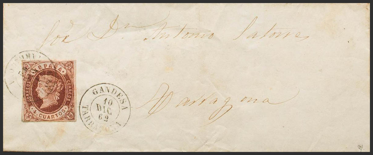 58. 1862. 4 cuartos castaño. GANDESA a TARRAGONA. Matasello GANDESA / TARRAGONA. MAGNIFICA Y MUY RARA. Ex-Tizón.