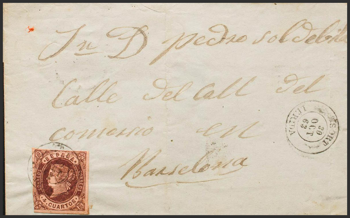 58. 1863. 4 cuartos castaño. SORT a BARCELONA. Matasello SORT / LERIDA. MAGNIFICA Y RARA. Ex-Tizón.