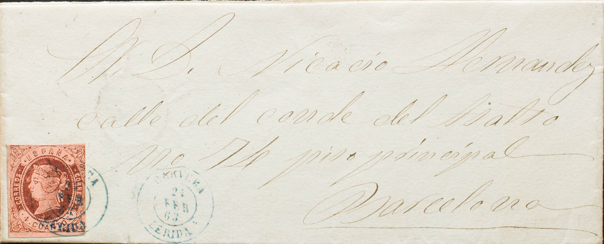 58. 1863. 4 cuartos castaño. CERVERA a BARCELONA. Matasello CERVERA / LERIDA, en azul. MAGNIFICA Y RARA. Ex-Tizón.