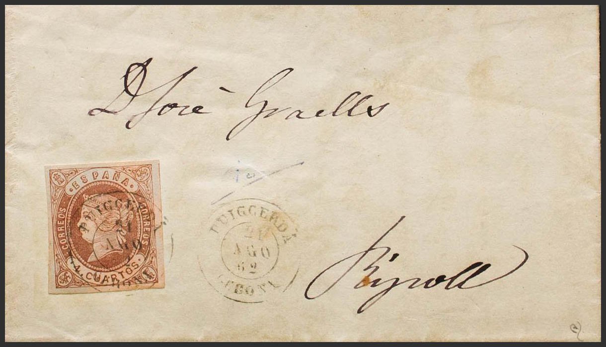 58. 1862. 4 cuartos castaño. PUIGCERDA a RIPOLL. Matasello PUIGCERDA / GERONA. MAGNIFICA. Ex-Tizón.